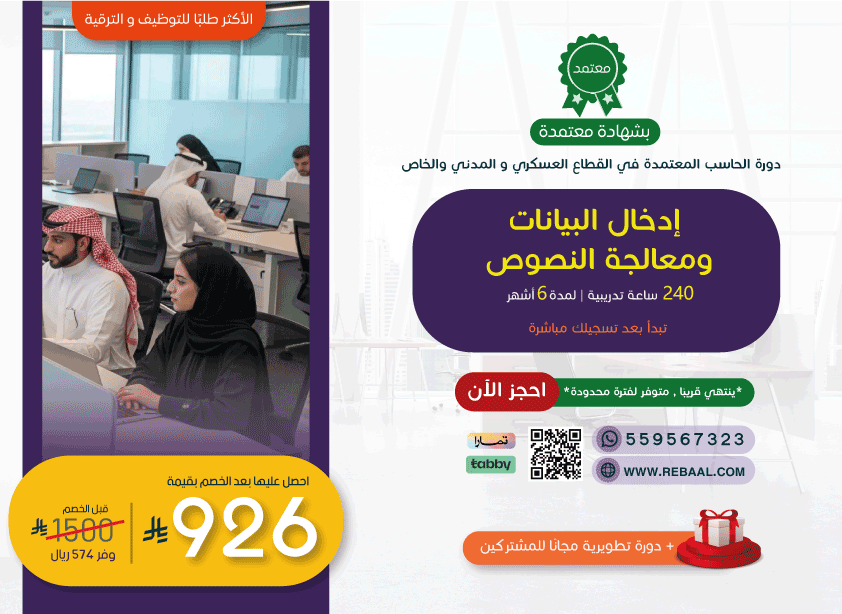 دورة إدخال البيانات ومعالجة النصوص دورة معتمدة من المؤسسة العامة للتدريب المهني والتقني ومدتها 6 اشهر بواقع 240 ساعة تدريبية. يتم من خلالها تقديم لمحة عن تقنية المعلومات ونظام التشغيل ويندوز والتدريب على استخدام برامج الحاسب الاساسية الوورد, الاكسل , والتدريب على مهارات الكتابة بطريقة اللمس على لوحة المفاتيح عربي-انجليزي حيث يتم تزويد المتدربين بأفضل الأساليب التدريبية العملية بأساسيات الحاسب الآلي ونظام التشغيل وبالمهارات والمعلومات المتخصصة والاحترافية اللازمة لإدخال البيانات ومعالجة النصوص ومهارات الكتابة بلوحة المفاتيح بطريقة اللمس بشكل احترافي وتأهيلهم لاستخدام البرامج المكتبية وورد, اكسل, والجداول الالكترونية والنصوص بحرفية عالية.